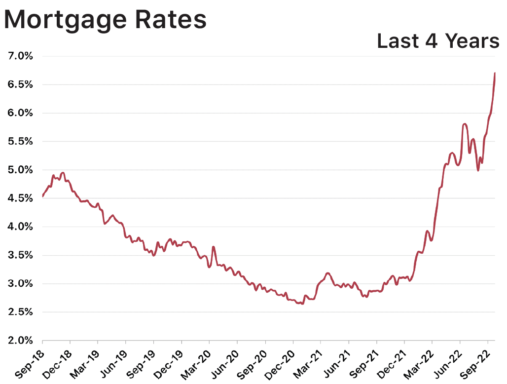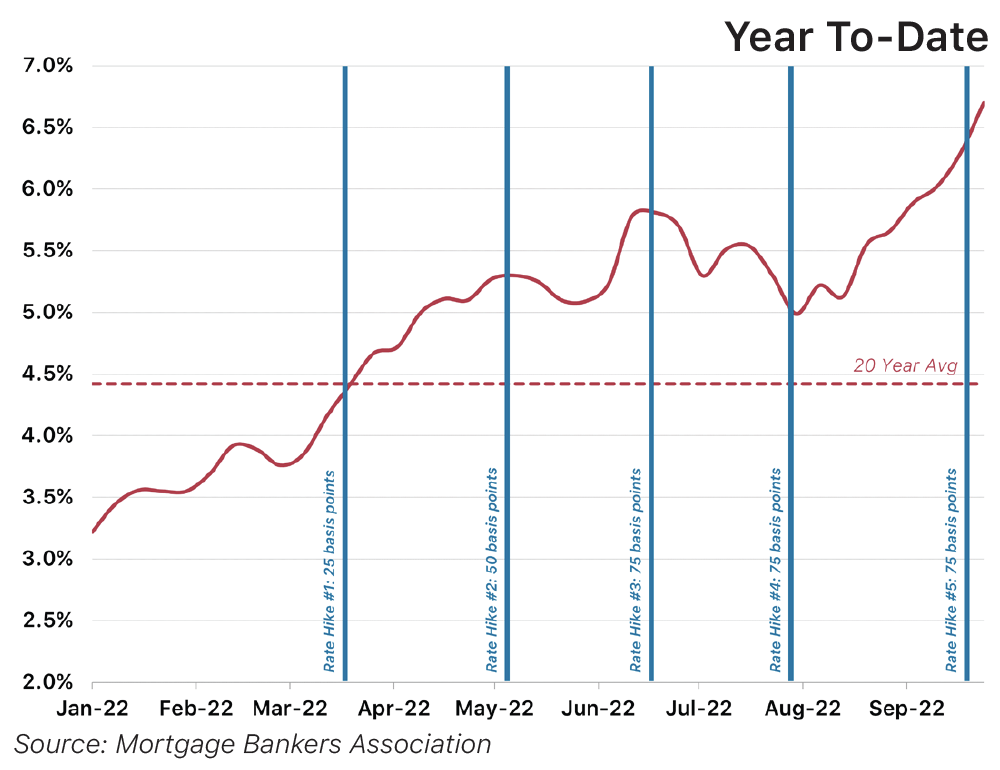 Mortgage rates appeared to be relaxing slightly through the first part of Q3 but quickly changed course following late July’s 75-basis point increase to the Fed Funds Rate. The Fed instituted two rate hikes during Q3 (July and September) totaling 150 basis points in an aggressive effort to curb inflation, which ultimately pushed the 30-year mortgage rate to 6.70% by the end of Q3 (highest level since July 2006). This uptick in interest rates is adding an estimated $259 to the monthly mortgage payment of a median-priced home, which translates to an additional +$3,100 per year and +$93,100 over the life of the loan (varies by loan term, state, and market).