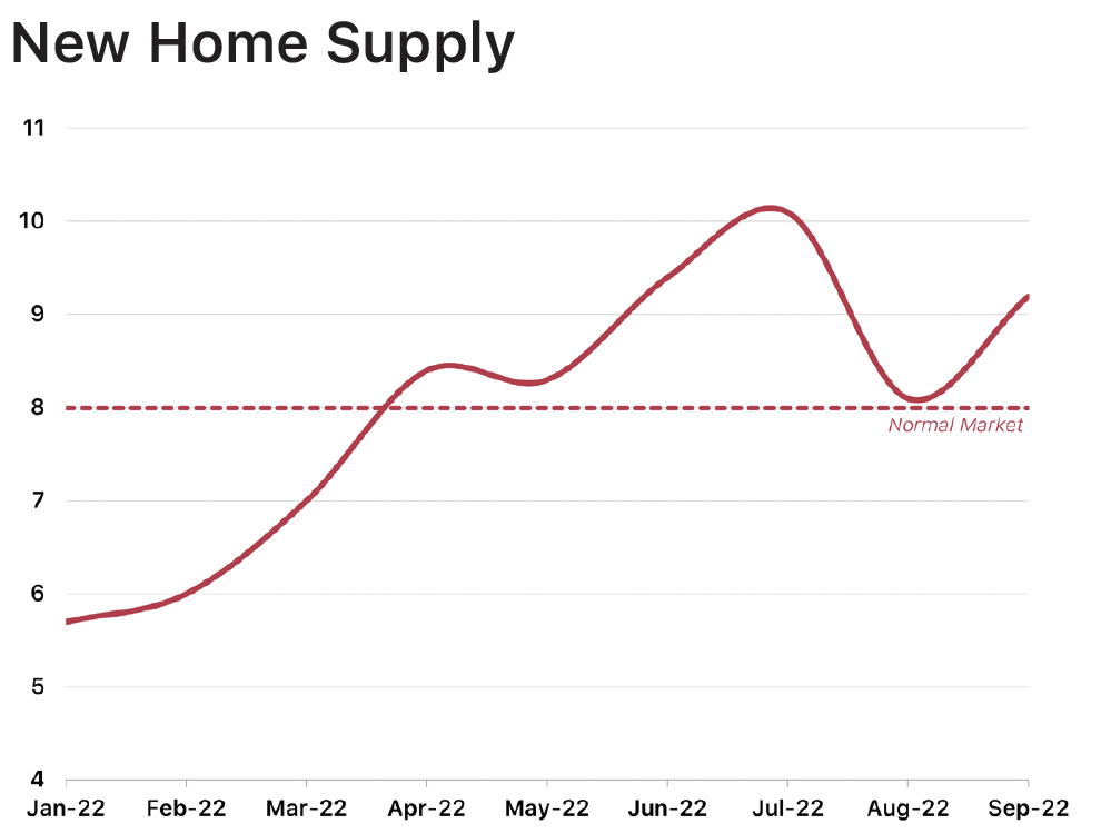 Despite the noticeable decline in new home sales and production activity since the beginning of the year, new SF home prices have remained at elevated, albeit inconsistent, levels. The median home price at the end of Q3 was $470,600 – lower than the record-high reached in July but an +8.8% increase over the last 3 months and a +14.8% increase since the start of the year. Decreasing construction costs, easing supply chains, and waning demand will likely lead to modest declines in the median sale price in the short term, however low supply will likely keep prices from bottoming out. The new home supply has improved steadily from the start of the year, increasing from 5.7 months in January to 9.2 months at the end of Q3. We expect supply levels to continue to rise moderately through the end of the year.