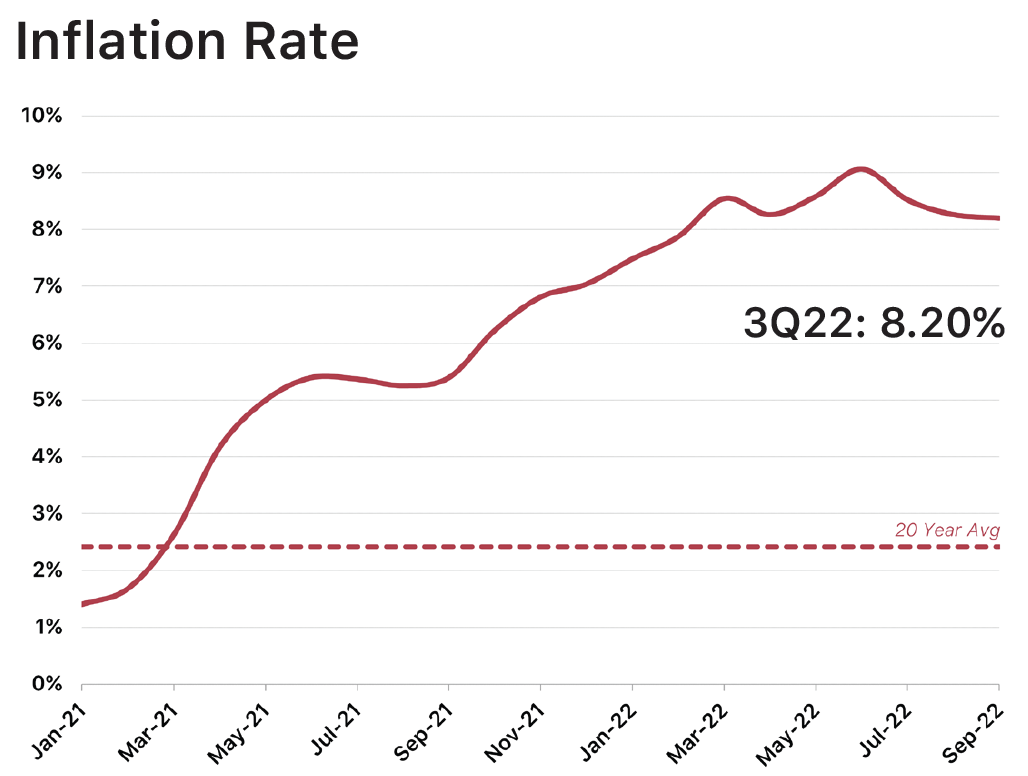 The Federal Reserve Bank increased rates twice during Q3 (150 total basis points) in an effort to curb inflation, however inflation remained sticky during this period. Inflation fell from 9.06% in Q2 to 8.20% in Q3, well below the expectations (and hopes) of national economists. The Fed is committed to reducing inflation and is expected to increase rates by another 150 basis points before the end of 2022. The current sentiment is that it will likely be 2025 before inflation returns to the Fed’s 2% benchmark.