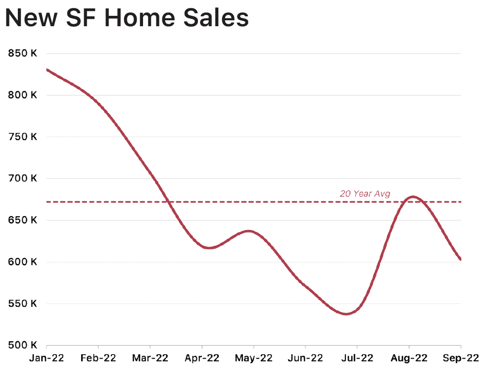 New SF home sales hit a historic low of 543K in July before rebounding modestly in August and September. SF sales improved +5.6% from their Q2 level but have declined -28.1% since the start of the year. Demand for new homes, and therefore new home sales, will likely remain below the 20-year average as would-be buyers react to factors such as high home prices, rising mortgage rates, and inflation. Additionally, most homebuilders are responding to the dip in buyer demand by reducing the number of new home starts (despite persistent issues with low supply); less starts will undoubtedly contribute to fewer sales as the market corrects itself over the coming months.