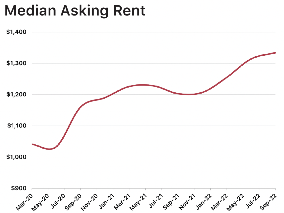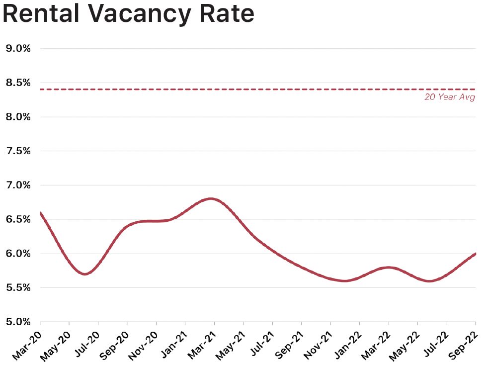 Historically low vacancy rates, an indicator of high demand, continue to drive monthly rent increases, although we did see a deceleration in rent growth during Q3. The median asking rent increased by +1.5% during Q3, compared to +4.7% in Q2 and +4.0% in Q1. Despite the notable uptick in rental unit starts during Q3, elongated construction times combined with strong demand are expected to keep the available supply of rental units low and prevent the median asking rent figure from experiencing a significant decline.