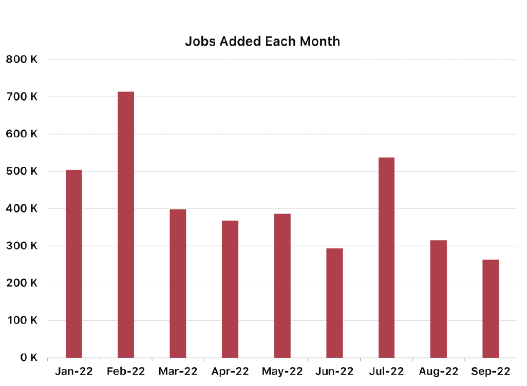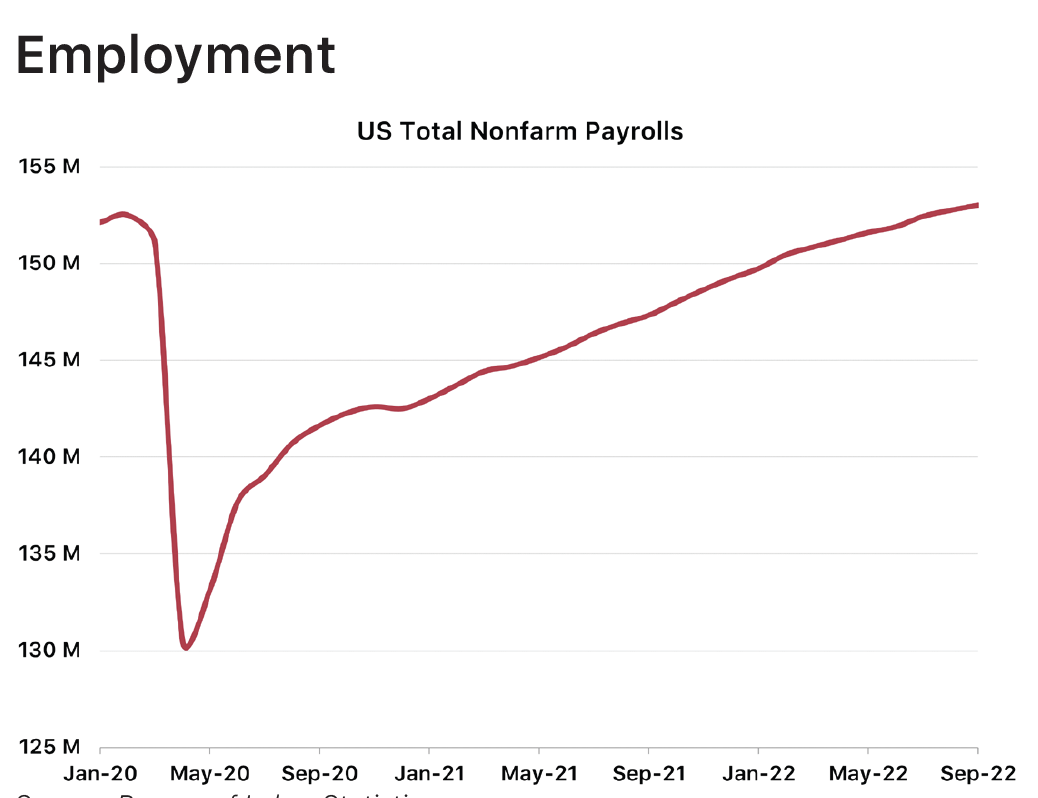 A bright spot in the national economy continues to be employment. Despite stubborn inflation and growing fears of a recession, the U.S. added +1.1 M jobs in Q3 and has added +3.8 M jobs since the beginning of the year. The unemployment rate remains below 4%, considered “full employment,” and we expect seasonal hirings during Q4 to keep employment on its upward trajectory through the end of the year.