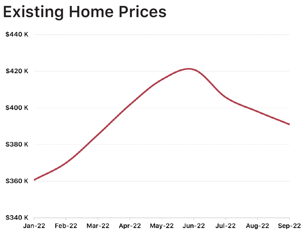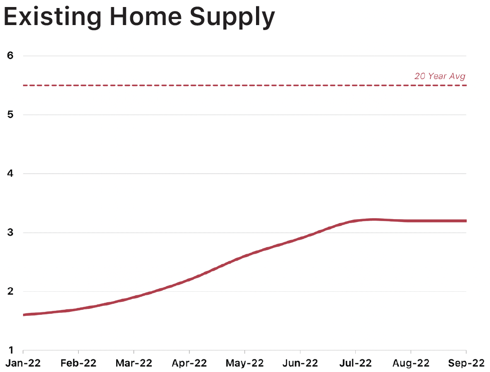 The median sale price for existing homes declined during every month of Q3, falling by -7.1% since the end of June. Despite this (much needed) price relief, prices are still up +7.0% since the beginning of the year and +8.1% over the last 12 months. Home prices have fallen due to cooling demand, and while we expect further declines during Q3 based on seasonal factors and waning demand, the low supply of homes will continue to prop prices up until supply and demand return to a more balanced state.