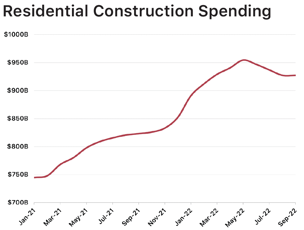 U.S. residential construction spending declined for the fourth straight month in September, ending Q3 at $927.25 B. While residential construction spending declined modestly during Q3 (-2.1%), it remains elevated on both a year-to-date (+8.8%) and annual (+12.7%) basis. We expect a further pullback in residential construction spending over the coming months based on supressed demand and declining starts and construction activity.