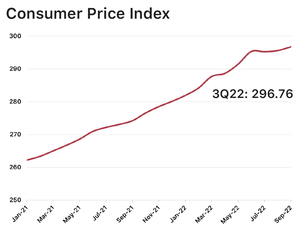 The Consumer Price Index remained relatively flat during Q3, increasing by +0.48% from Q2 and by +8.22% since the beginning of the year. Ideally, we would have seen the CPI decline during Q3, however it’s encouraging to note that the rate of CPI increases has declined significantly; the +0.48% increase in Q3 is a notable improvement over the +2.65% increase we saw in Q2 and the +2.71% increase we saw in Q1. In Q3, declining gas and energy process were largely offset by increases in food, shelter, and medical care.
