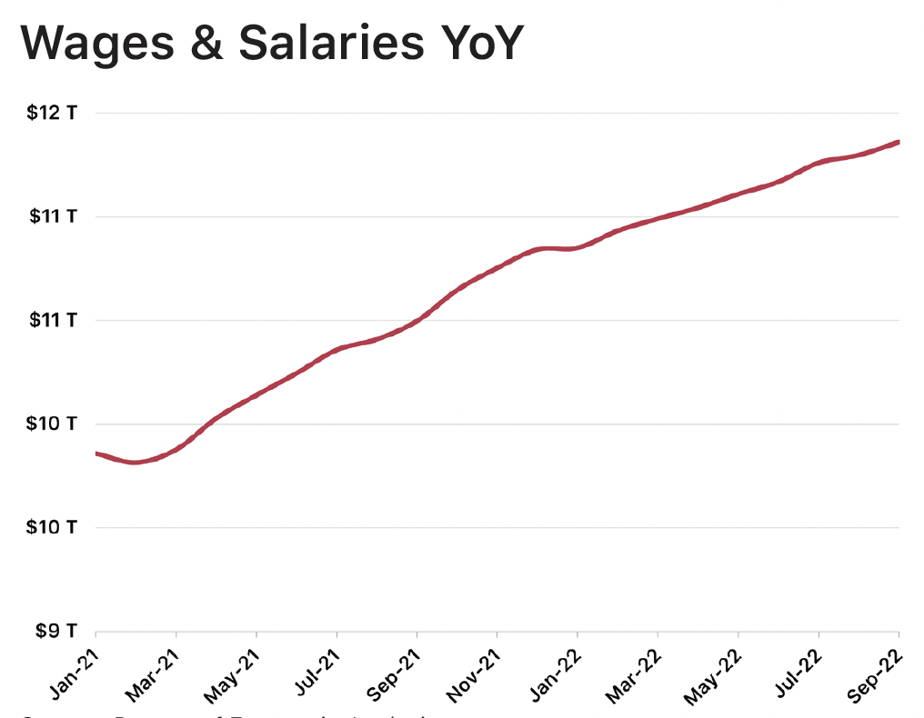 Wages & salaries continued their upward trajectory in Q3, increasing by +1.7% from the end of June. Wages & salaries have increased by +4.8% since the start of the year and by +8.2% over the last 12 months. While +8% annual growth is well above the long term average, it’s worth noting that the annual growth has decelerated for 6 consecutive months. Additionally, this annual increase is largely being offset by high inflation and the comparatively high costs of consumer goods and services.