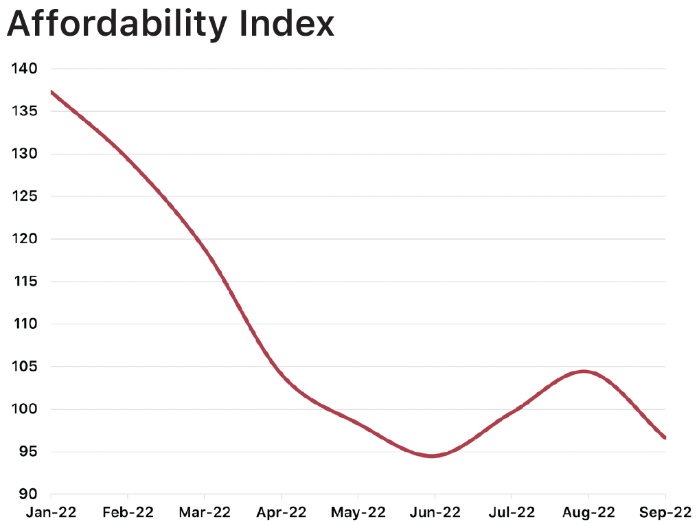 The Affordability Index rebounded modestly in August but fell below the baseline level of 100 again in September to 96.6, indicating that the typical American family can no longer afford a median-priced home. The Affordability Index has declined by -29.6% since January and by -34.2% over the last 12 months. While demand for housing still exists, buyers are much less willing to overpay and are looking to recoup some of the additional mortgage expenses through discounts to the home price.