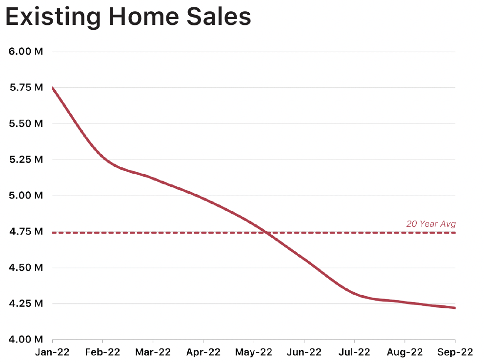 The deceleration of annualized existing home sales flattened slightly during Q3, declining by -7.5% over this period as compared to the -10.9% decline in Q2. Existing home sales are down -22.0% since the beginning of the year and stand -11.0% below the 20-year average. Like new home sales, existing home sales are being impacted by high mortgage rates and market instability influencing many would-be homebuyers to delay their purchase.