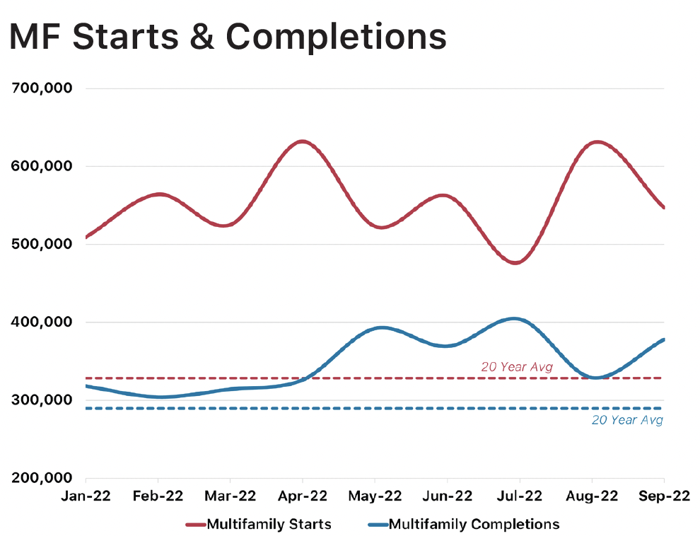 Q3 was defined by mixed messages: inflation remains high, but unemployment remains low. Negative GDP growth in Q1 and Q2 led to near-constant warnings of a looming recession, but national GDP actually expanded by +2.6% during Q3 (first estimate). Homebuilders are reporting double-digit decreases in contracts and sales but also reporting double-digit increases in annual revenue. Single-family housing starts are down, but multifamily starts remain well above their long-term average. The CPI continued to climb, but so did the average wage. So, what does this mean?