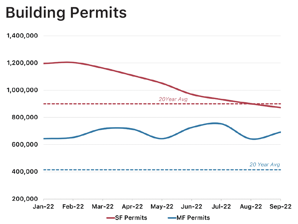 Annualized single-family permits have declined for 7 straight months, dipping below the 20-year average for the first time since the height of the pandemic (June 2020) during Q3. SF permits declined by -10.1% during Q3 and are down -22.0% since the beginning of the year. Multifamily permit activity has fared better and remains well above the 20-year average; MF permits declined by -4.7% during Q3 but have increased by +23.4% on an annual basis.