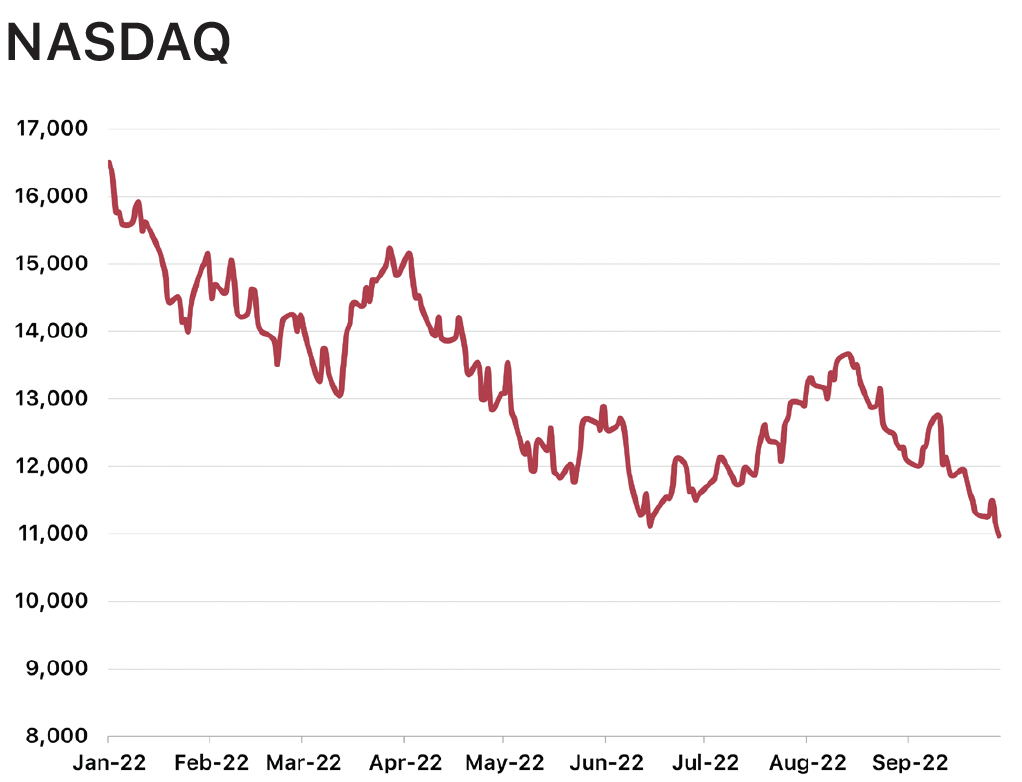 The stock market rebounded to its highest level since mid-April in August following a strong jobs report and declining energy prices but reverted to a downward trajectory through the end of August and September. The S&P 500 Index declined by -4.9% during Q3 and is down -23.9% since the beginning of the year. The NASDAQ posted similar numbers, declining by -4.6% during Q3 and by -32.8% since the start of the year. Movements in the stock market are volatile from day-to-day and are being heavily influenced by factors including inflation, tightening monetary policy (rate hikes), high interest rates, and geopolitical instability (namely the Russian-Ukraine conflict).