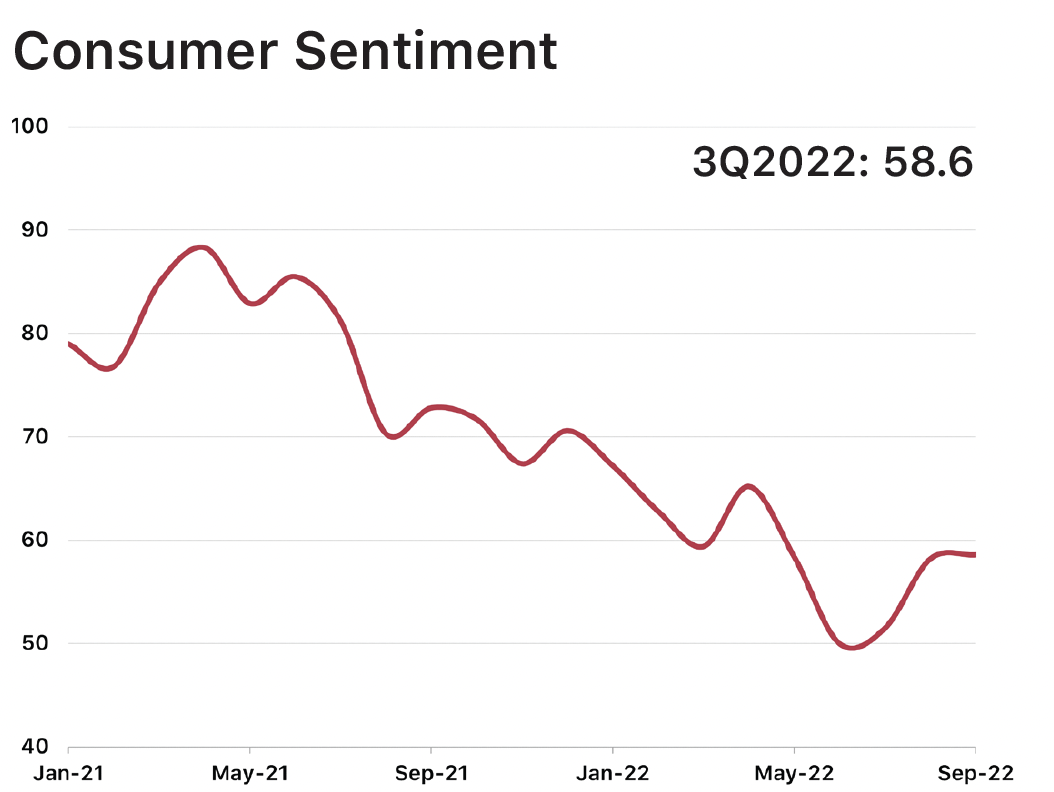 After hitting the lowest level on record (50.0) at the end of Q2, Consumer Sentiment rebounded modestly during Q3 to 58.6 and currently stands at a 5-month high. This rebound was driven by a noticeable drop in gas prices combined with strong jobs reports but kept in check due to modest declines in the long-term outlook of business conditions and fears of a looming recession. Despite Q3’s bump, Consumer Sentiment is down -17.0% since January and -19.5% over the last 12 months and is expected to remain well below the long-term average level as consumers contend with the economy’s mixed signals.