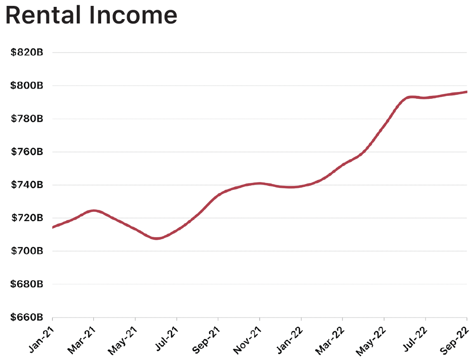 The deceleration of asking rents was reflected in a similar deceleration of rental income growth during Q3. Rental income increased by just +0.5% during Q3, as compared to +5.3% growth in Q2 and +1.8% growth in Q1. Despite the deceleration, annualized rental income growth in Q3 (+8.5%) remains well above 2021 levels (+3.4%). We expect total rental income to continue to flatten over the coming months, but strong demand should keep income levels from declining significantly.